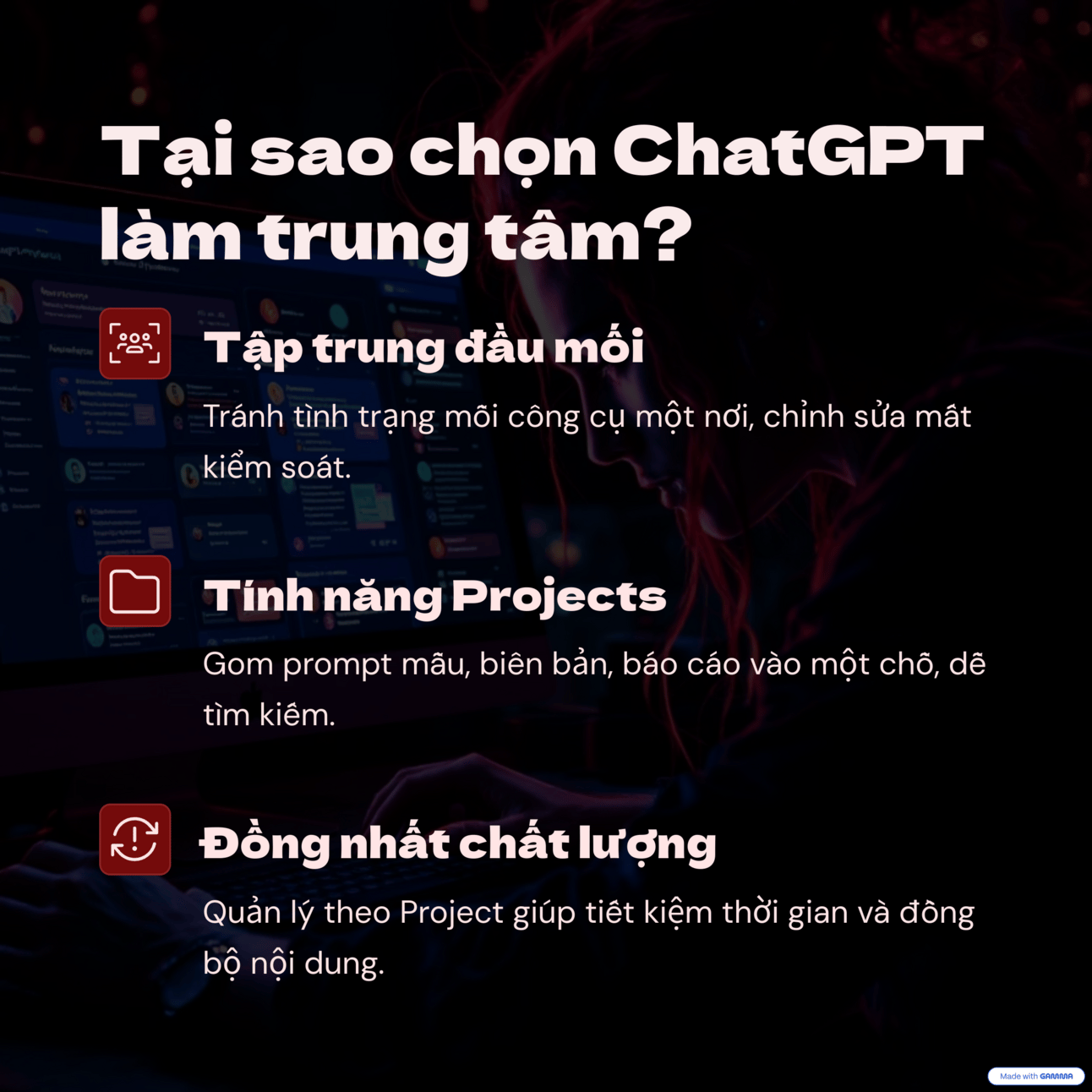 Đặc biệt, hiện tại Projects của ChatGPT cho phép mình tạo từng project riêng, gom các bản nháp, prompt mẫu, biên bản, báo cáo lại cùng một chỗ, giúp việc tìm kiếm và chỉnh sửa trở nên rất nhanh. Mình luôn khuyên các bạn dân văn phòng sử dụng chức năng này của ChatGPT vì nó tùy biến được nhanh hơn, và chất lượng đầu ra cũng được đồng nhất hơn.