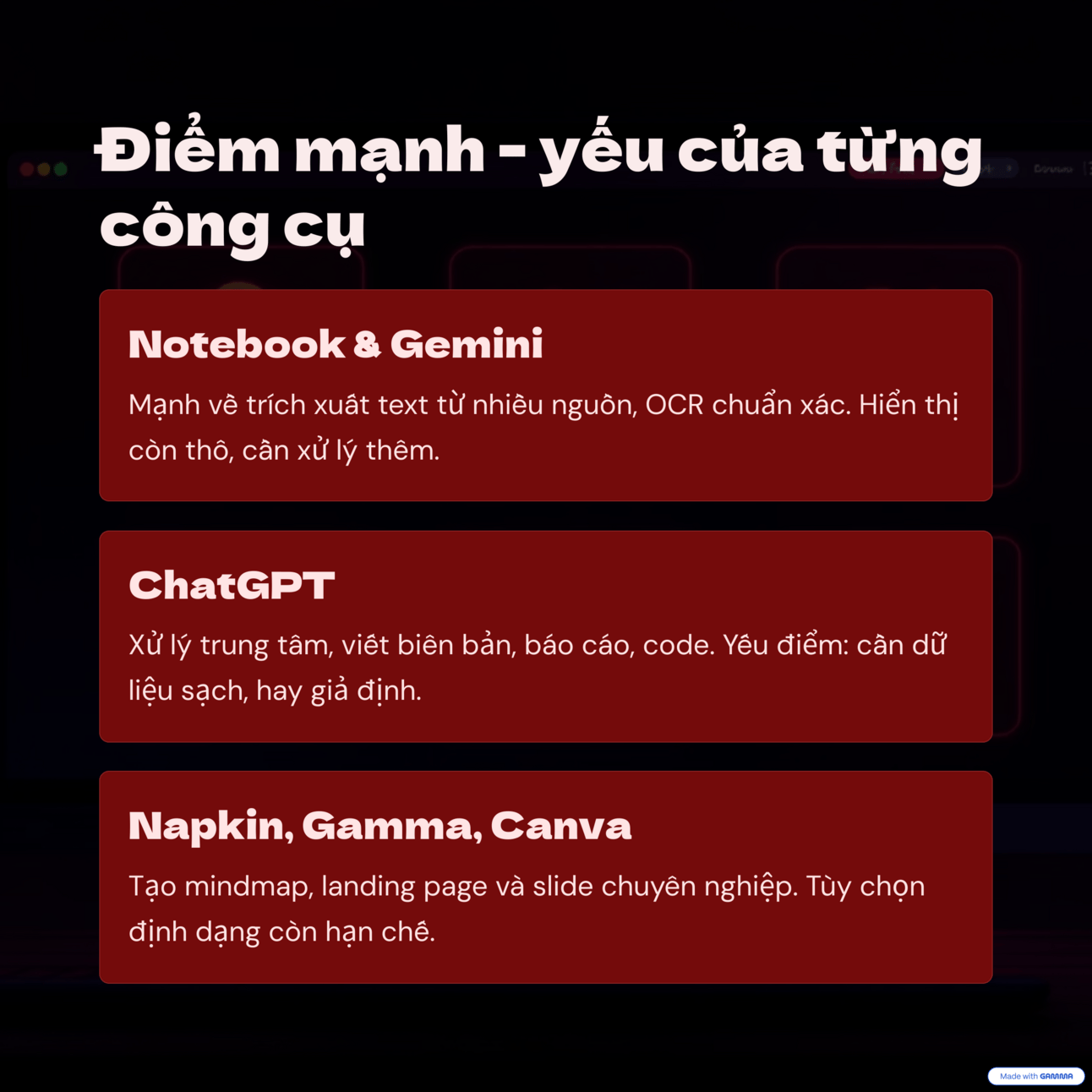 Pha 3 – Trình bày sản phẩm: Dùng Napkin để sơ đồ hóa, Canva để dựng slide nhanh, Gamma để xuất landing page chia sẻ.